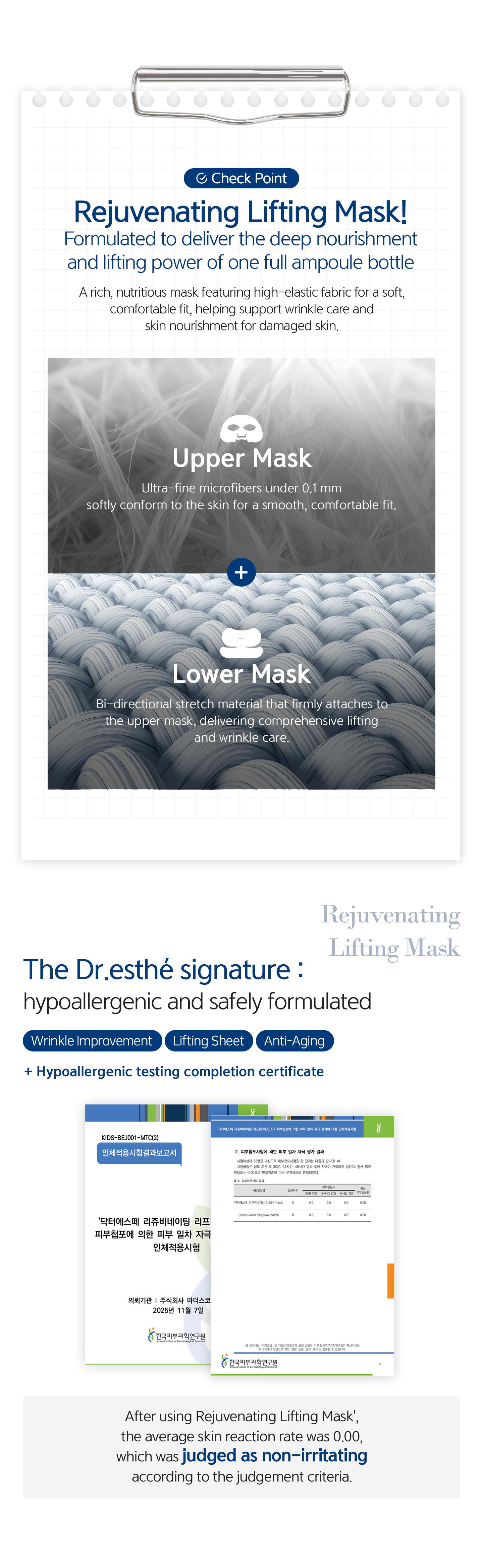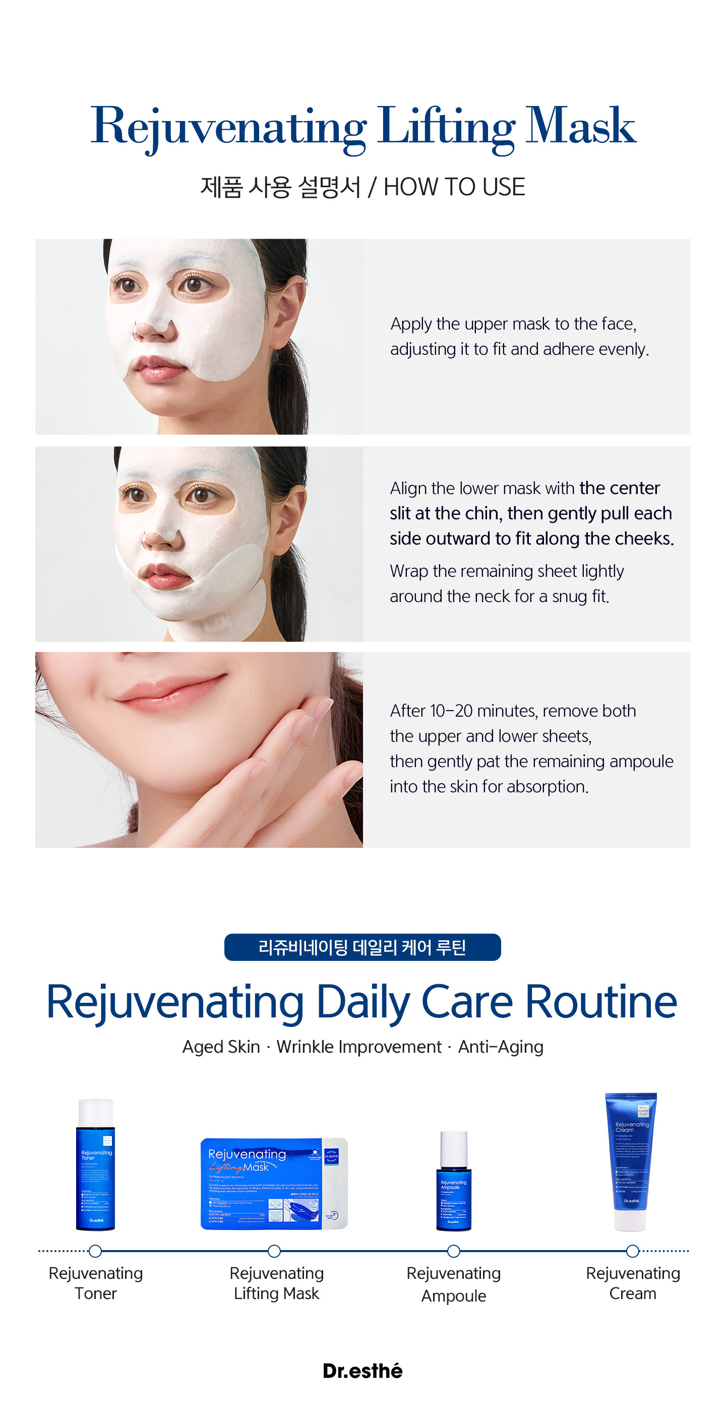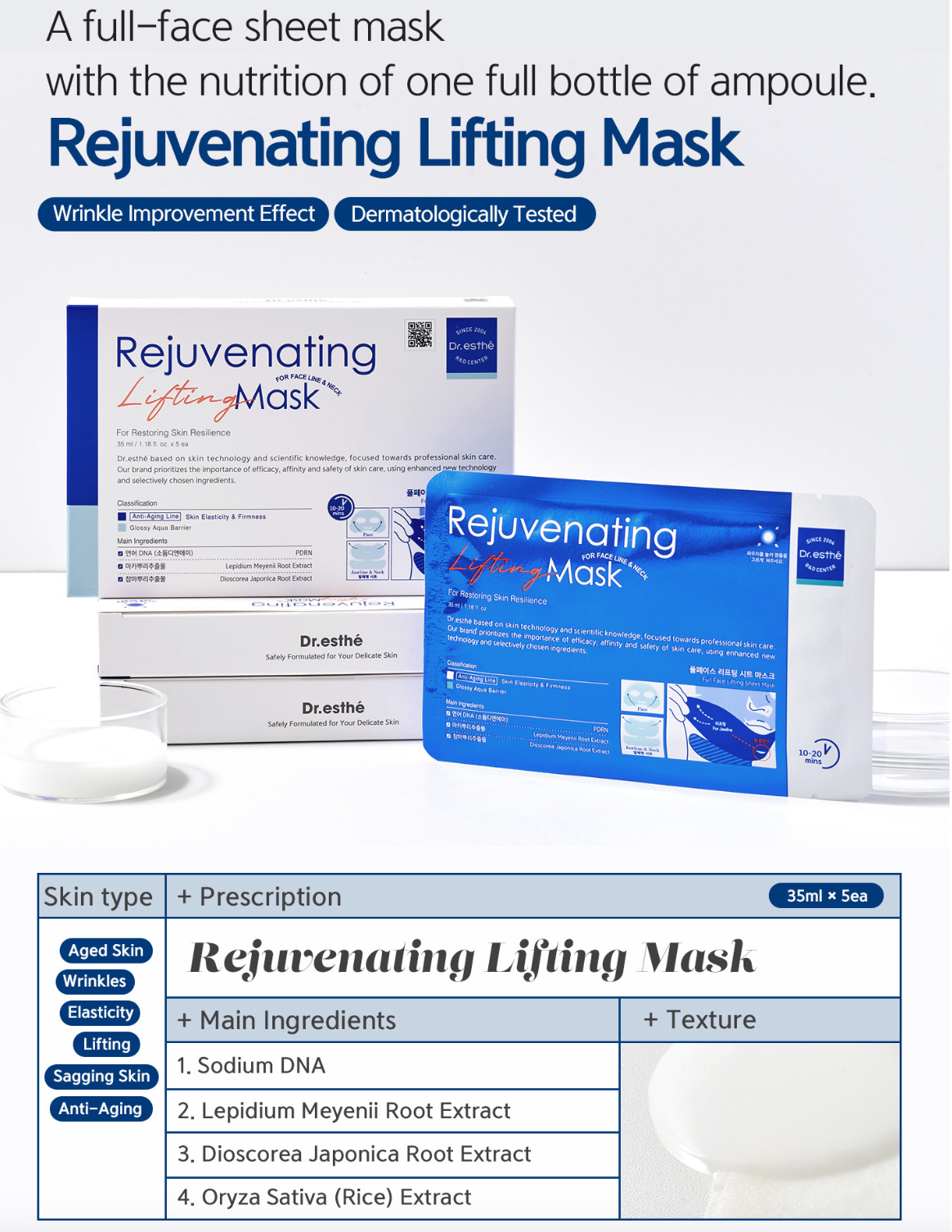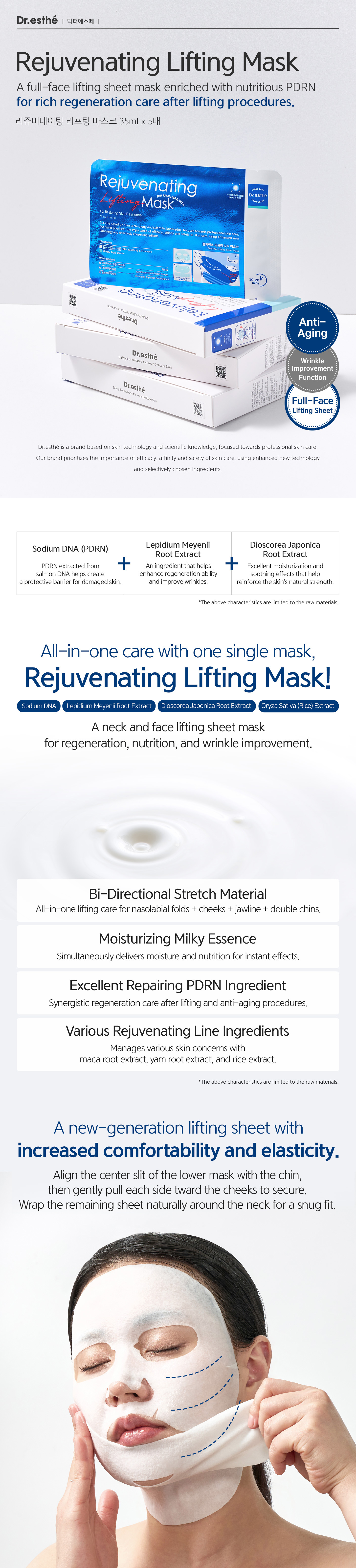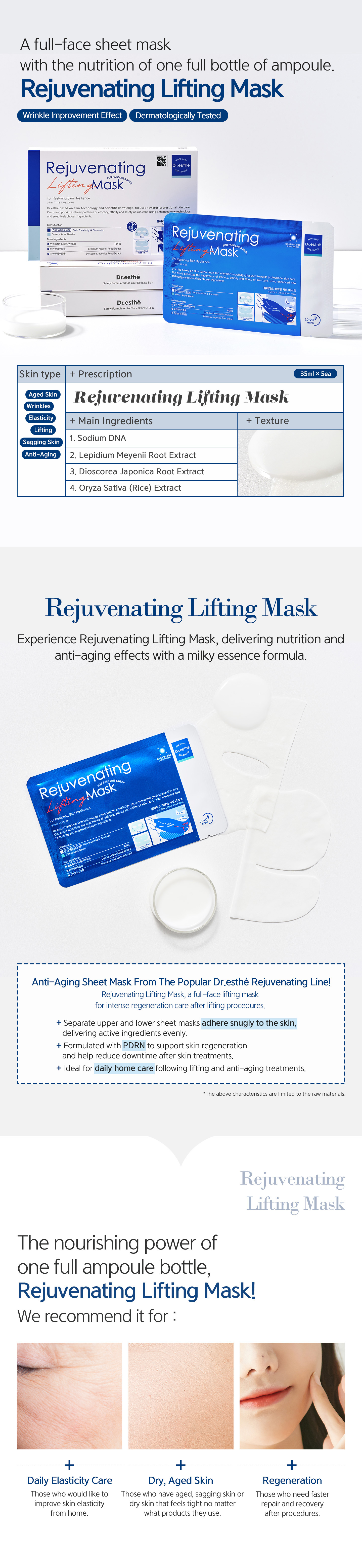 The Rejuvenating Lifting Mask is a high performance professional grade treatment mask designed to visibly tighten, lift, and refine the skin while supporting long term skin regeneration. Each mask is saturated with a concentrated essence that delivers deep hydration, structural firmness, and visible skin density improvement in a single application.